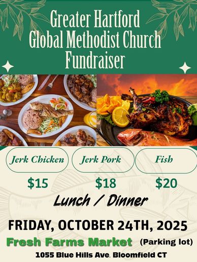 Greater Hartford Global Methodist Church, we believe in faith, fellowship, and good food that brings people together. On Friday, October 24th, 2025, we invite you to enjoy a mouthwatering meal of jerk chicken, jerk pork, or fish at Fresh Farms Market in Bloomfield, CT. Every plate you purchase not only fills your stomach but also supports the mission and ministries of our church as we continue serving Windsor, Hartford, and beyond.